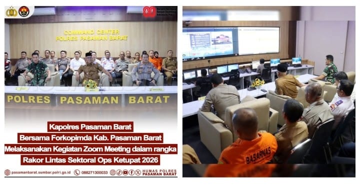 PASAMAN BARAT-Borneoindonesianews.com,-Suasana serius namun penuh semangat tampak di ruang Command Center Polres Pasaman Barat ketika jajaran Forkopimda Kabupaten Pasaman Barat berkumpul mengikuti rapat koordinasi lintas sektoral melalui Zoom Meeting dalam rangka persiapan Operasi Ketupat 2026. Kegiatan ini dipimpin langsung oleh Kapolres Pasaman Barat AKBP Agung Tribawanto, S.I.K., yang menegaskan pentingnya sinergi seluruh unsur dalam menjaga keamanan masyarakat selama momentum Idul Fitri.