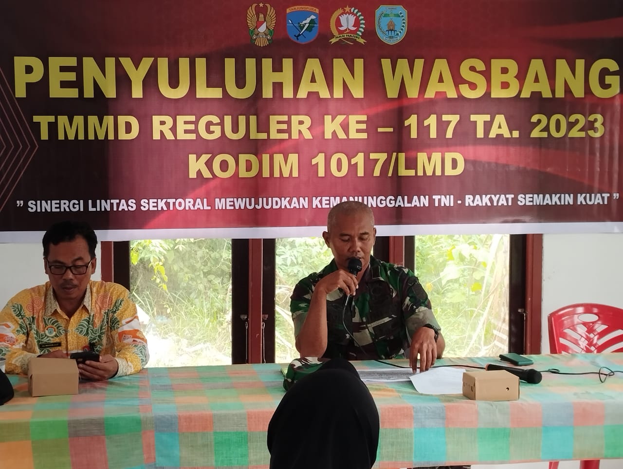 Lamandau-Borneoindonesia.com,-Bertempat di Aula Desa Batu Ambawang Kec. Sematu Jaya Kab. Lamandau, Danramil 01/Bulik merangkap pasi Ter Kodim 1017/Lmd Kapten Inf Eko Yunianto pada kesempatan ini memberikan penyuluhan WASBANG (Wawasan kebangsaan) TMMD Reguler 117 Ta. 2023 bagi warga Desa Batu Ambawang, Kamis(20/07/23).