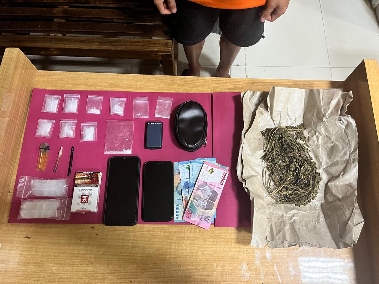 Di lokasi kedua, petugas kembali menemukan sembilan paket sabu yang disimpan dalam dompet kecil, serta satu bungkus narkotika jenis daun ganja kering. Selain itu, turut diamankan sejumlah barang bukti lain berupa timbangan digital, kaca pirex, sendok dari pipet, plastik klip, dua unit ponsel, mancis, dan uang tunai sebesar Rp350.000 yang diduga hasil transaksi.