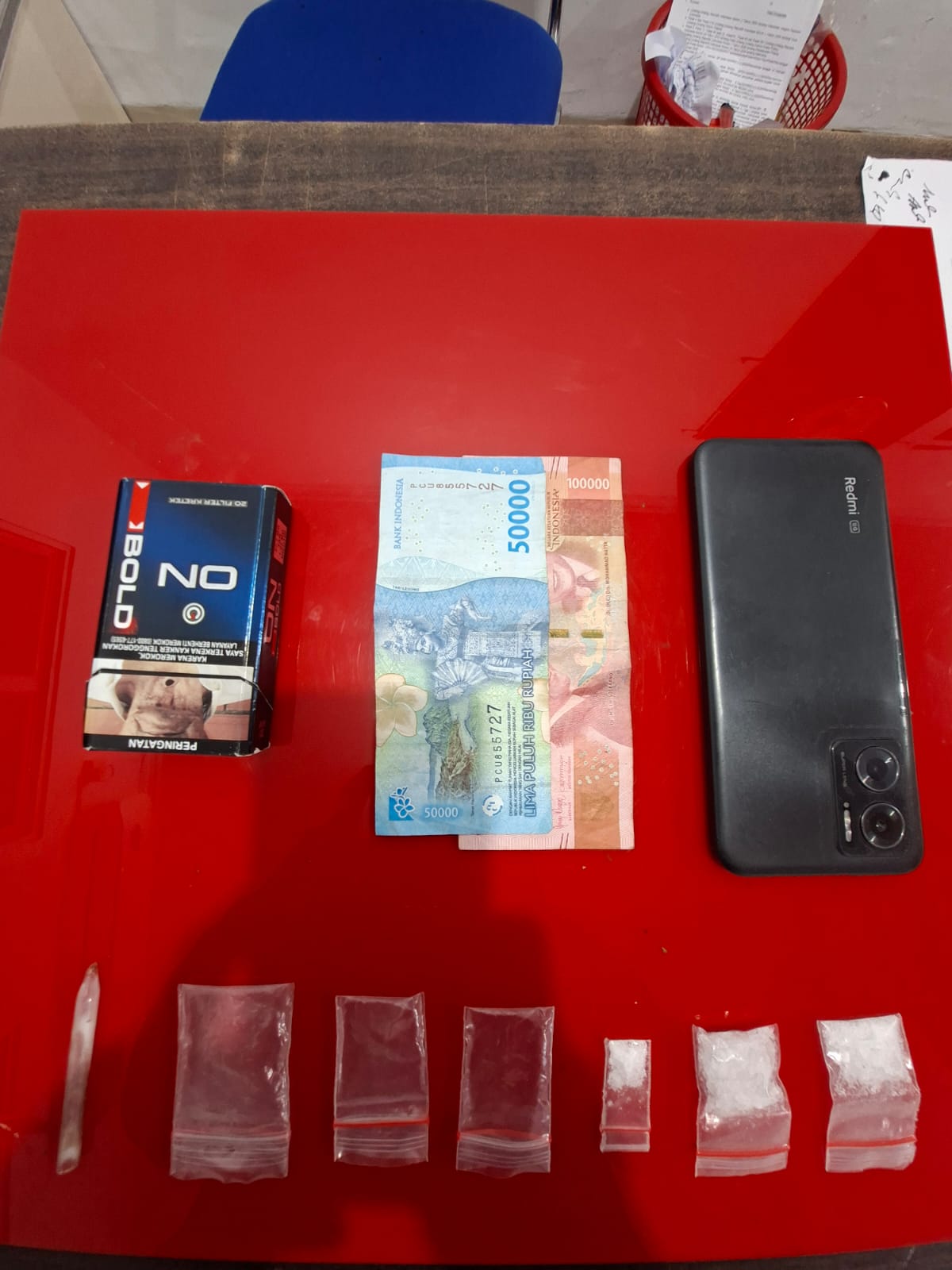 Saat dilakukan penggeledahan, petugas menemukan sejumlah barang bukti berupa tiga paket sabu yang dibungkus plastik klip bening, tiga lembar plastik klip kosong, satu kaca pirex, uang tunai sebesar Rp150.000, satu kotak rokok merek OnBold warna hitam, serta satu unit handphone android merek Redmi warna hitam.