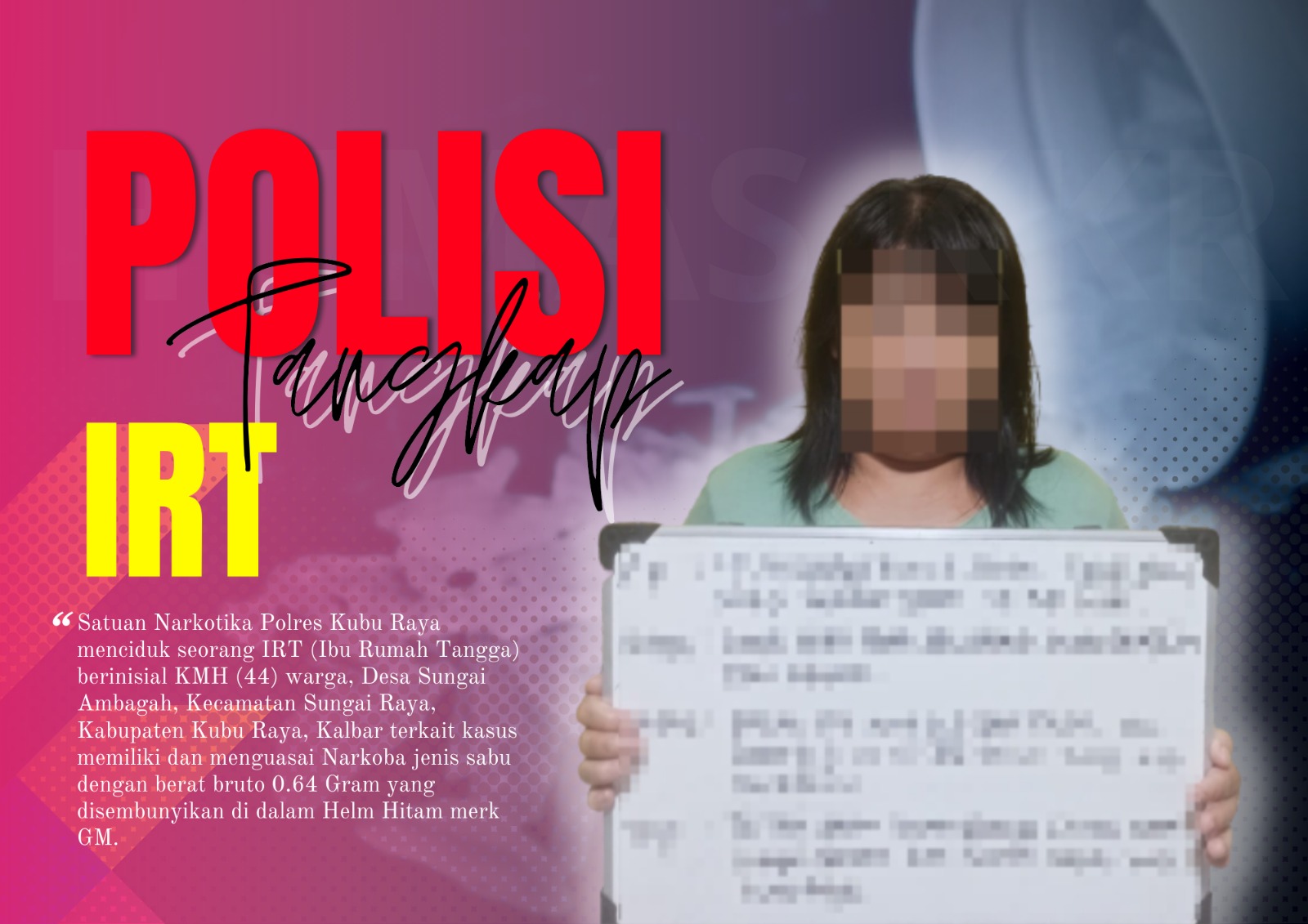Satuan Narkotika Polres Kubu Raya menciduk seorang IRT (Ibu Rumah Tangga) berinisial KMH (44) warga, Desa Sungai Ambagah, Kecamatan Sungai Raya, Kabupaten Kubu Raya, Kalbar terkait kasus memiliki dan menguasai Narkoba jenis sabu dengan berat bruto 0.64 Gram yang disembunyikan di dalam Helm Hitam merk GM.